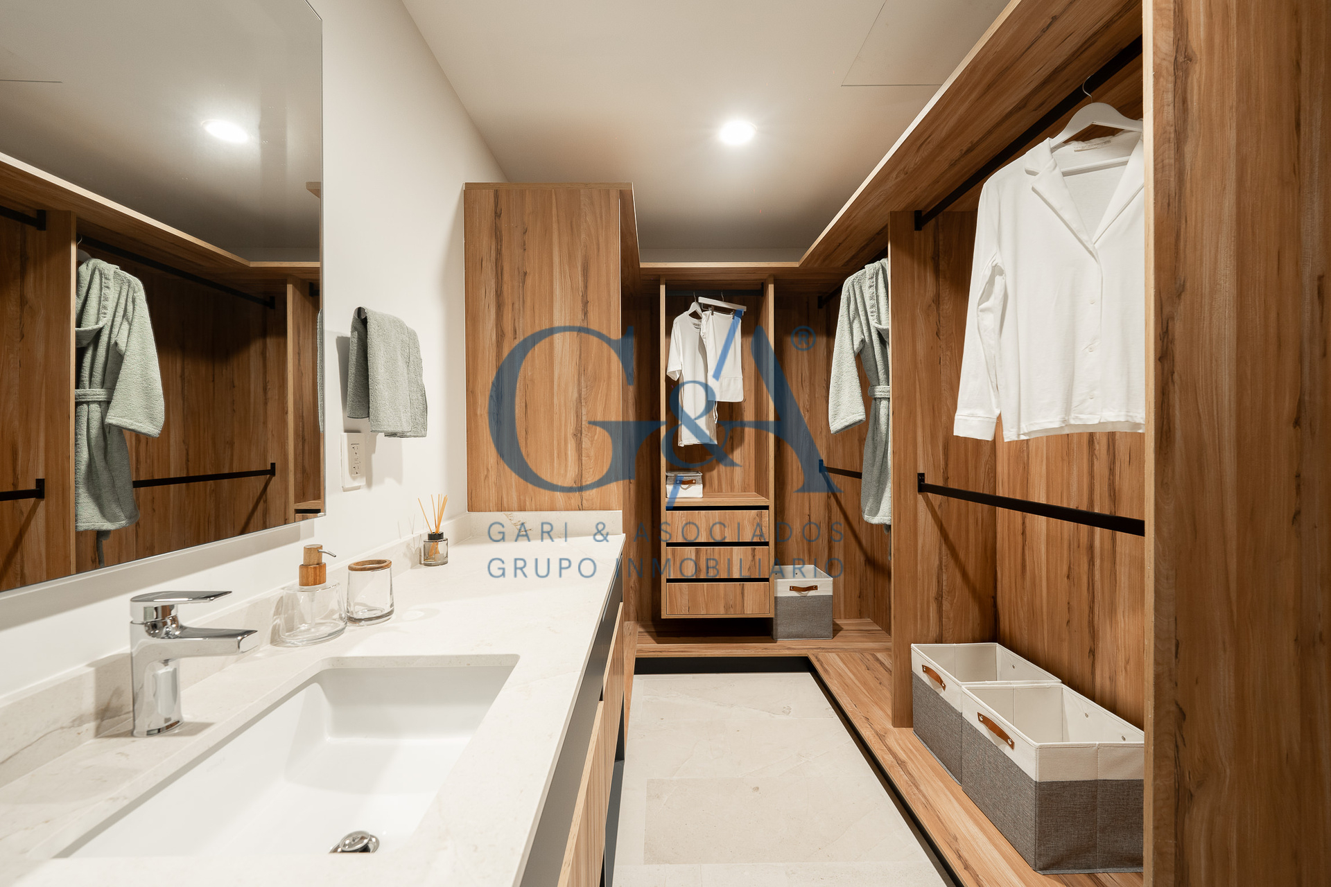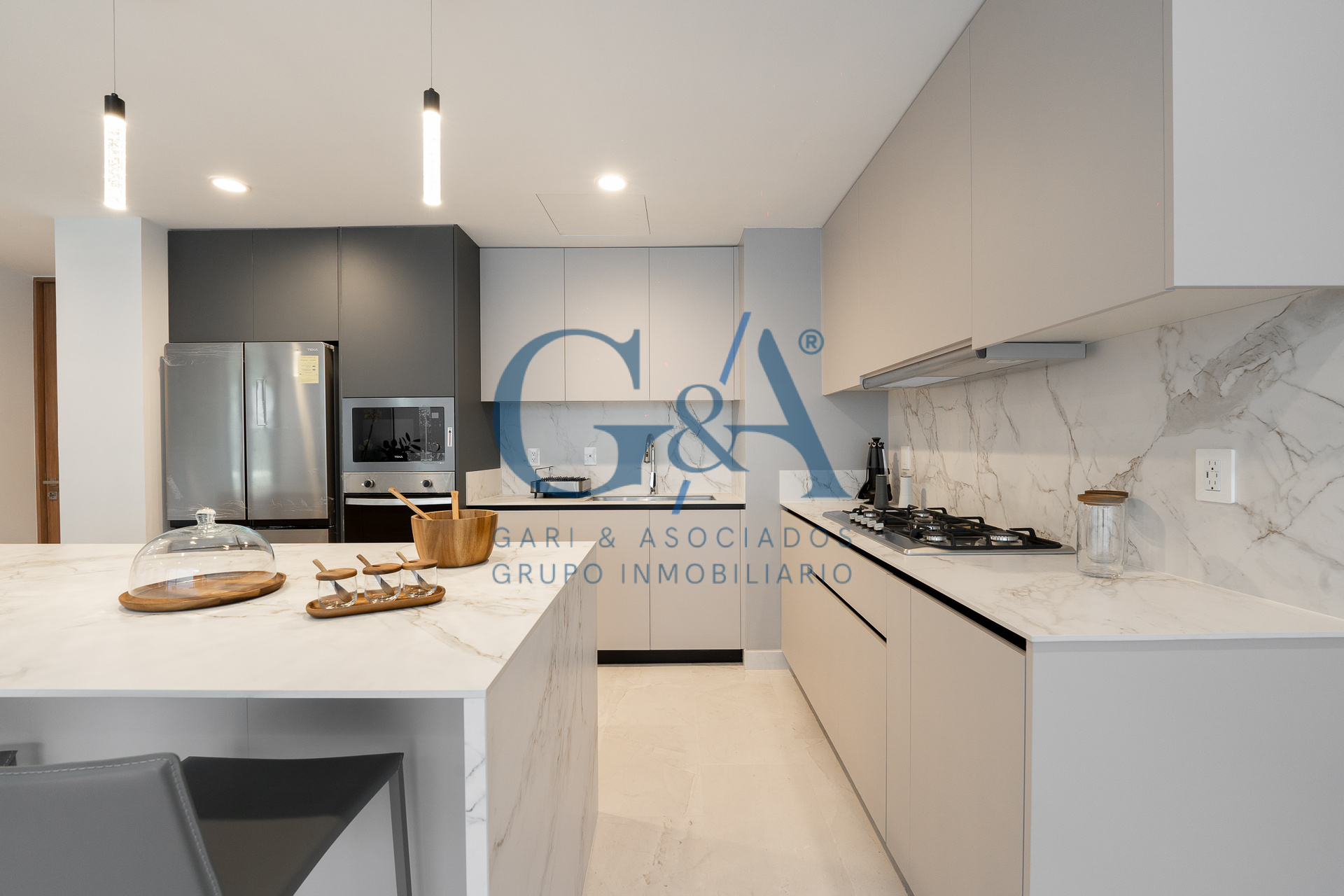 Cocina equipada con piedra tecnológica, electrodomésticos incluidos y sistema de cerrado lento.
